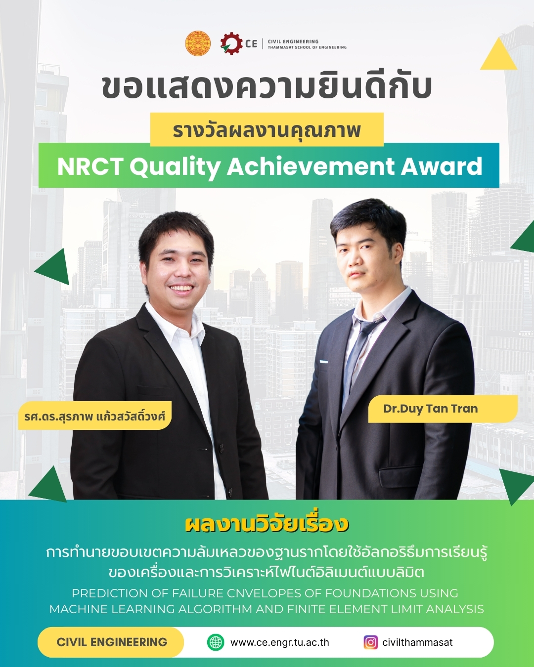 ภาควิชาวิศวกรรมโยธา ขอแสดงความยินดีกับ รศ.ดร.สุรภาพ แก้วสวัสดิ์วงศ์ และ DUY TAN TRAN กับ รางวัลผลงานคุณภาพ NRCT QUALITY ACHIEVEMENT AWARD (สาขาวิศวกรรมศาสตร์และอุตสาหกรรมวิจัย)